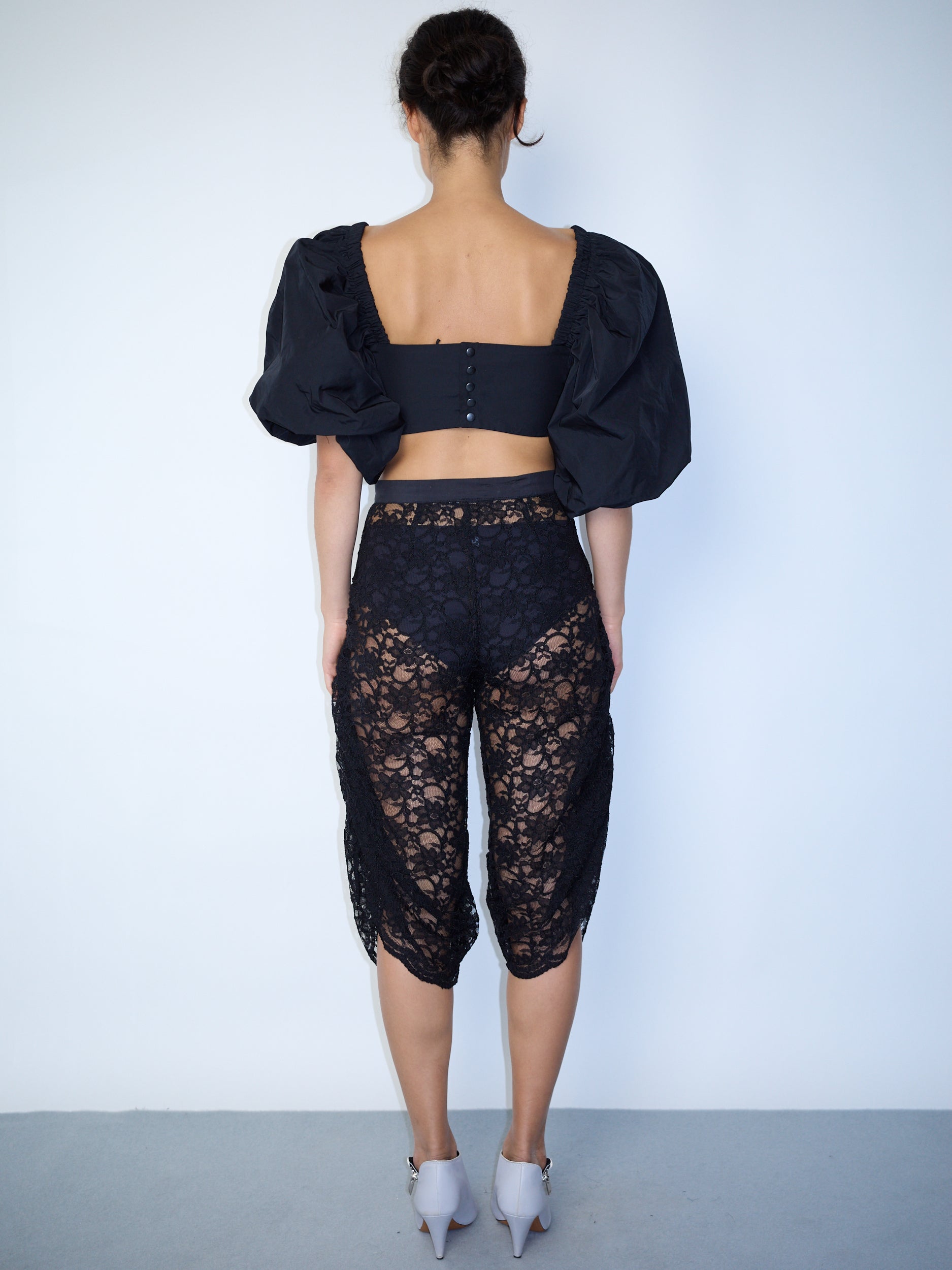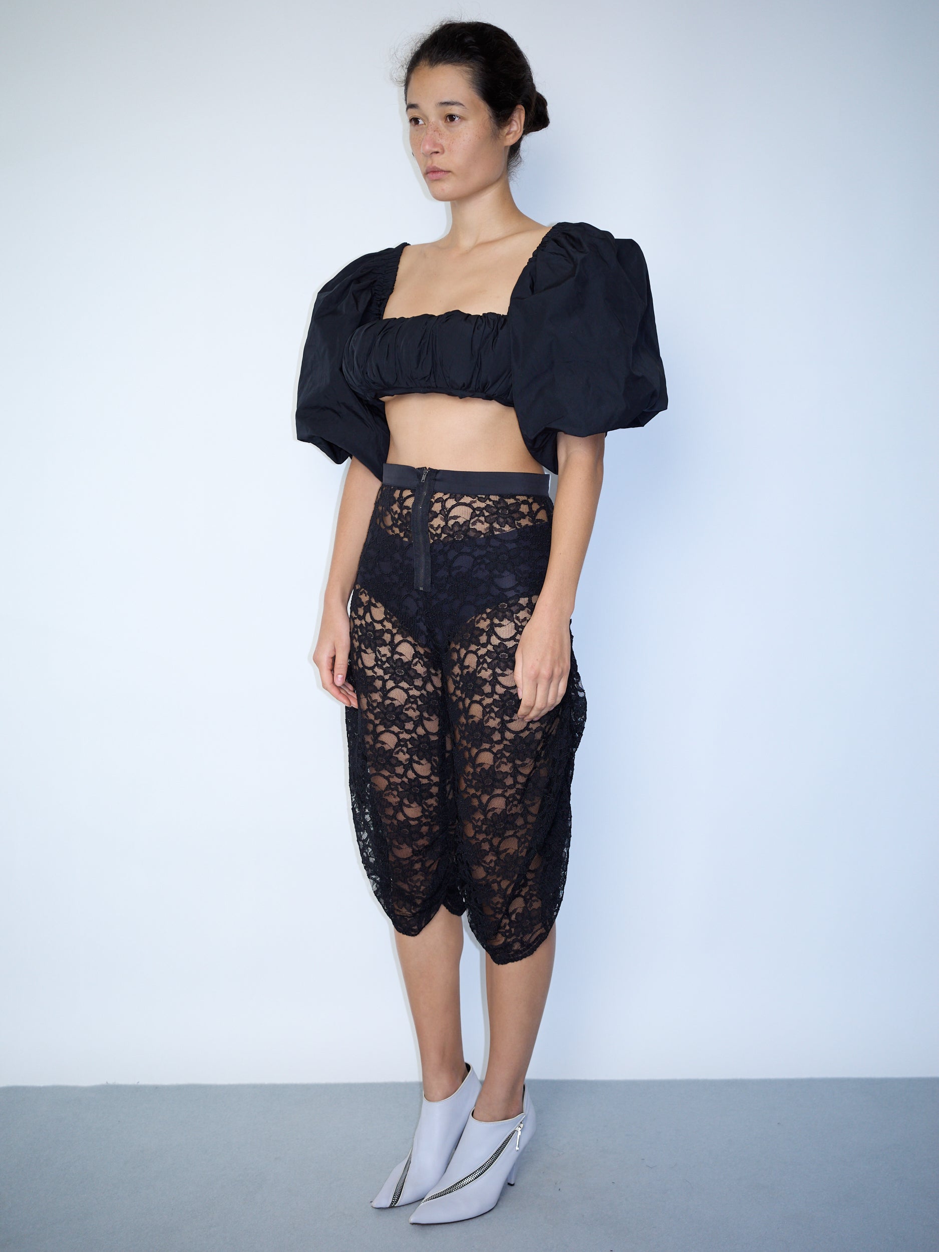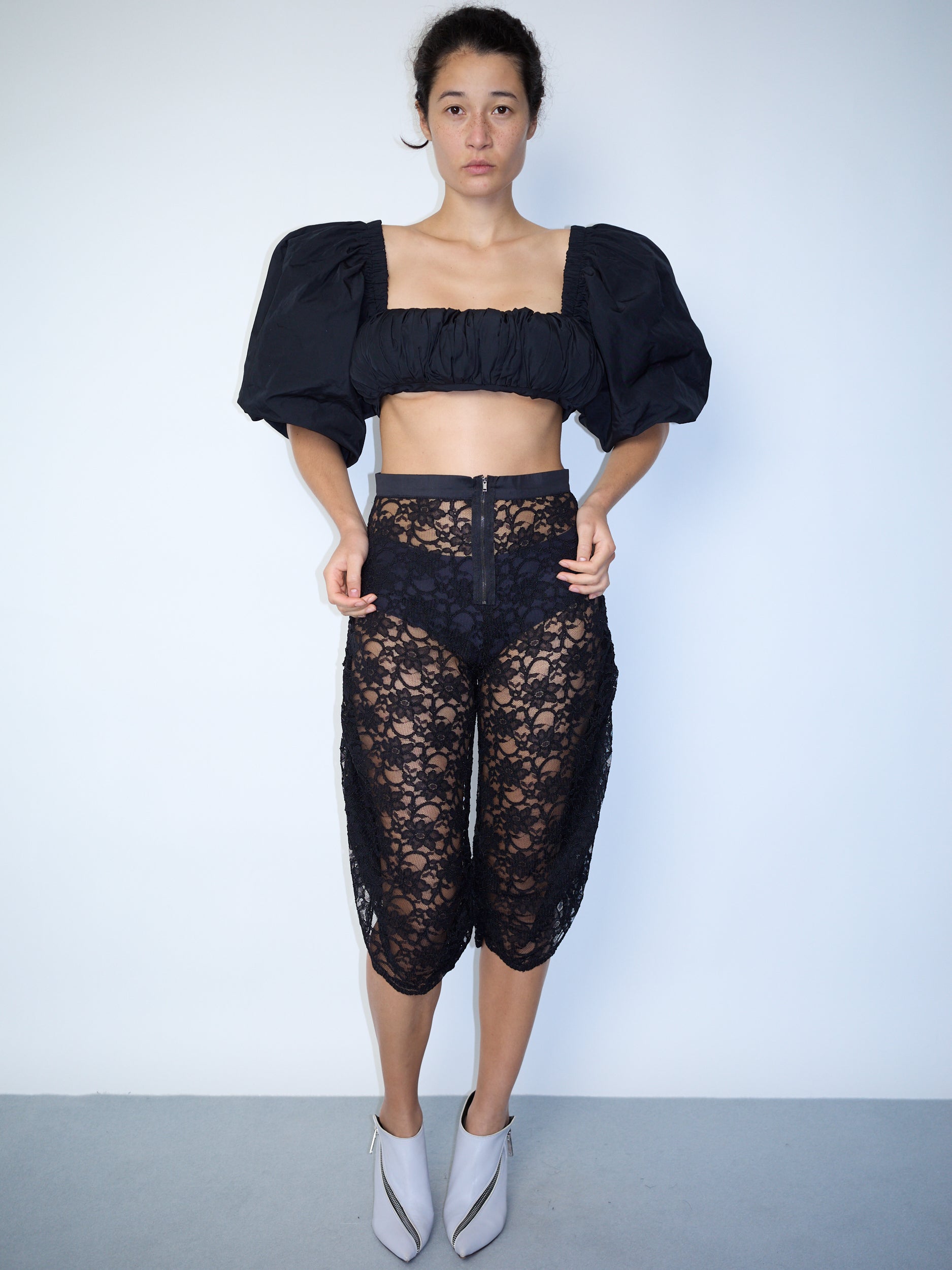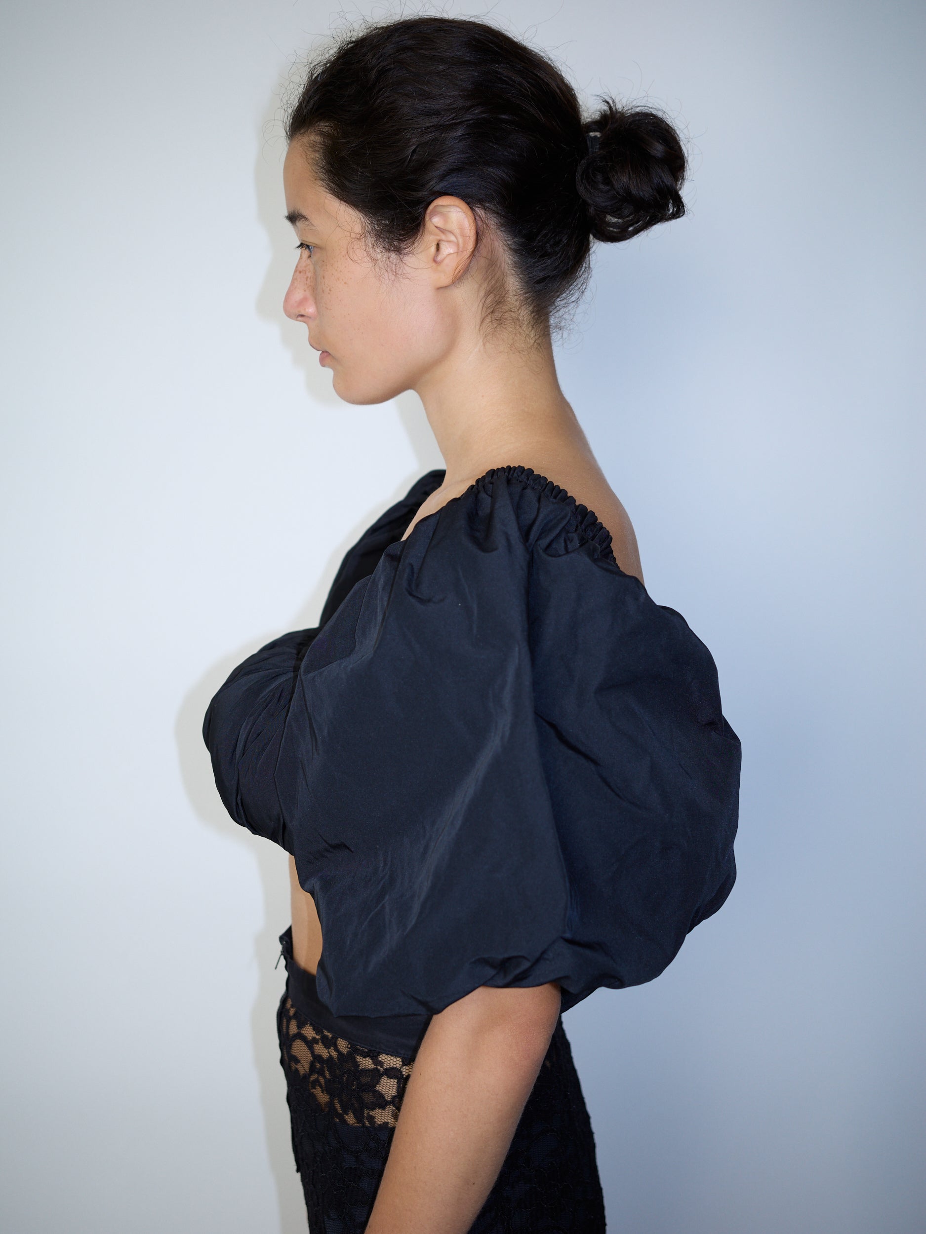 This short top features a padded, ruched bra section for added shape and texture. Paired with large, voluminous balloon sleeves crafted from crisp taffeta, it creates a dramatic and sculptural look.