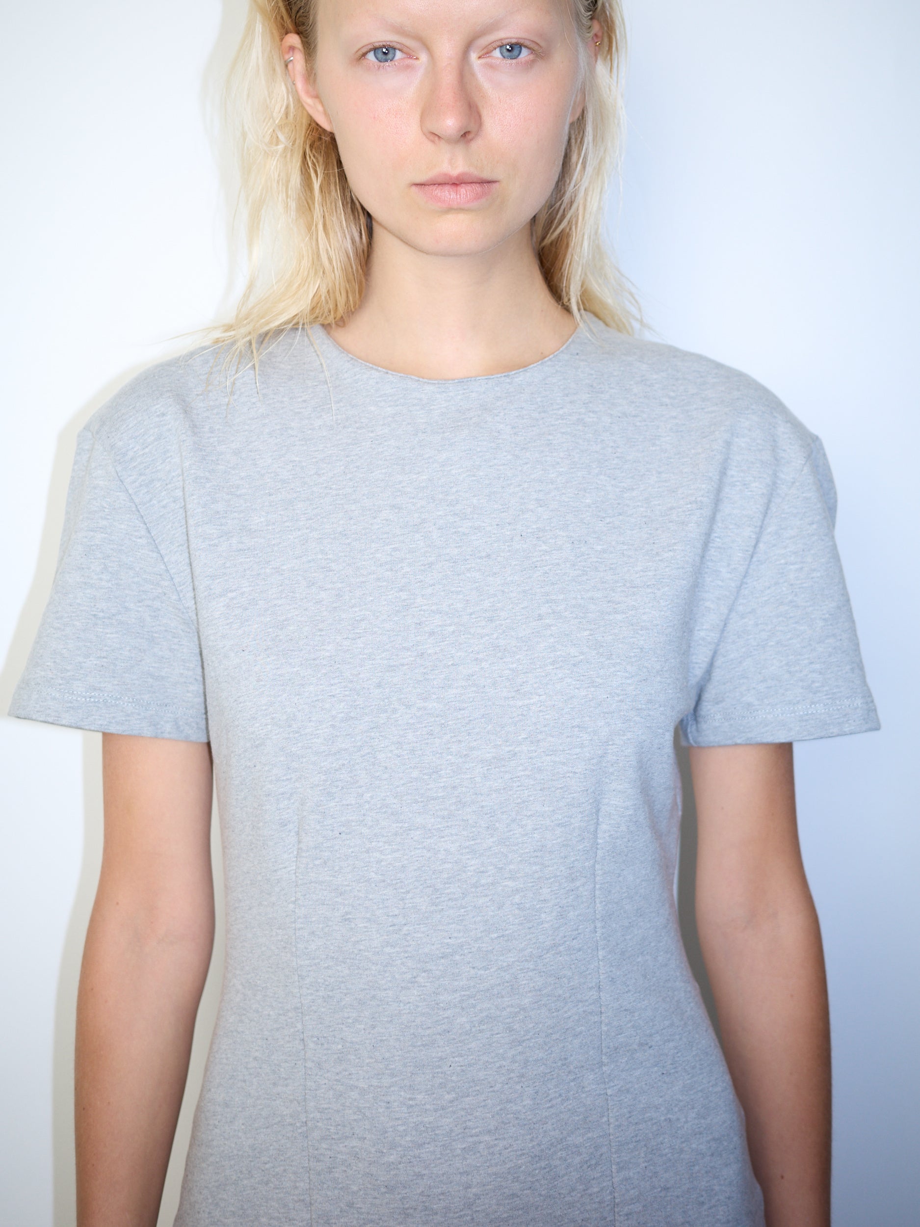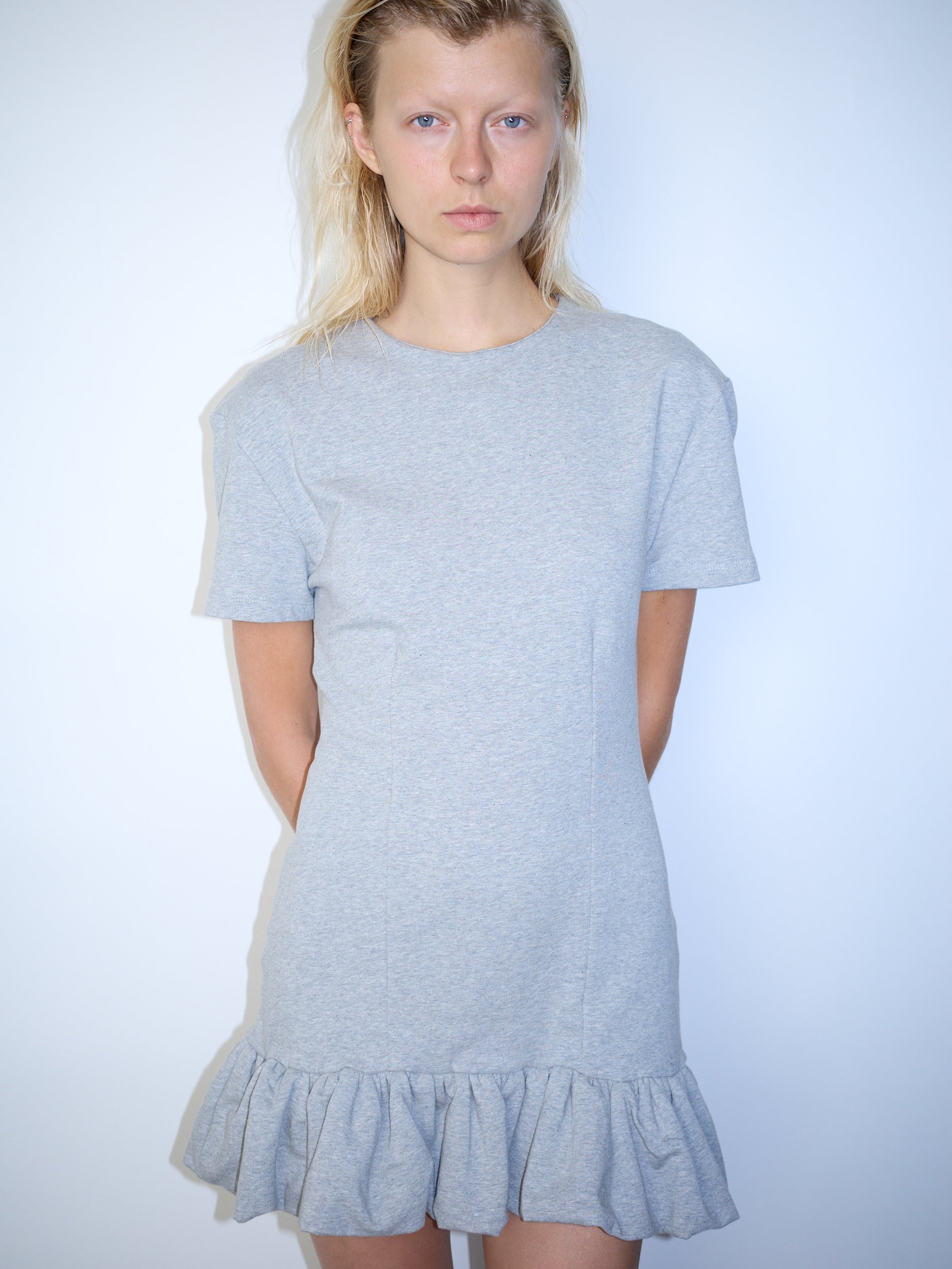 This dress features wide shoulders and a fitted silhouette for a strong, structured look. A dropped waist flows into a bubble hem skirt, adding playful volume and modern edge.