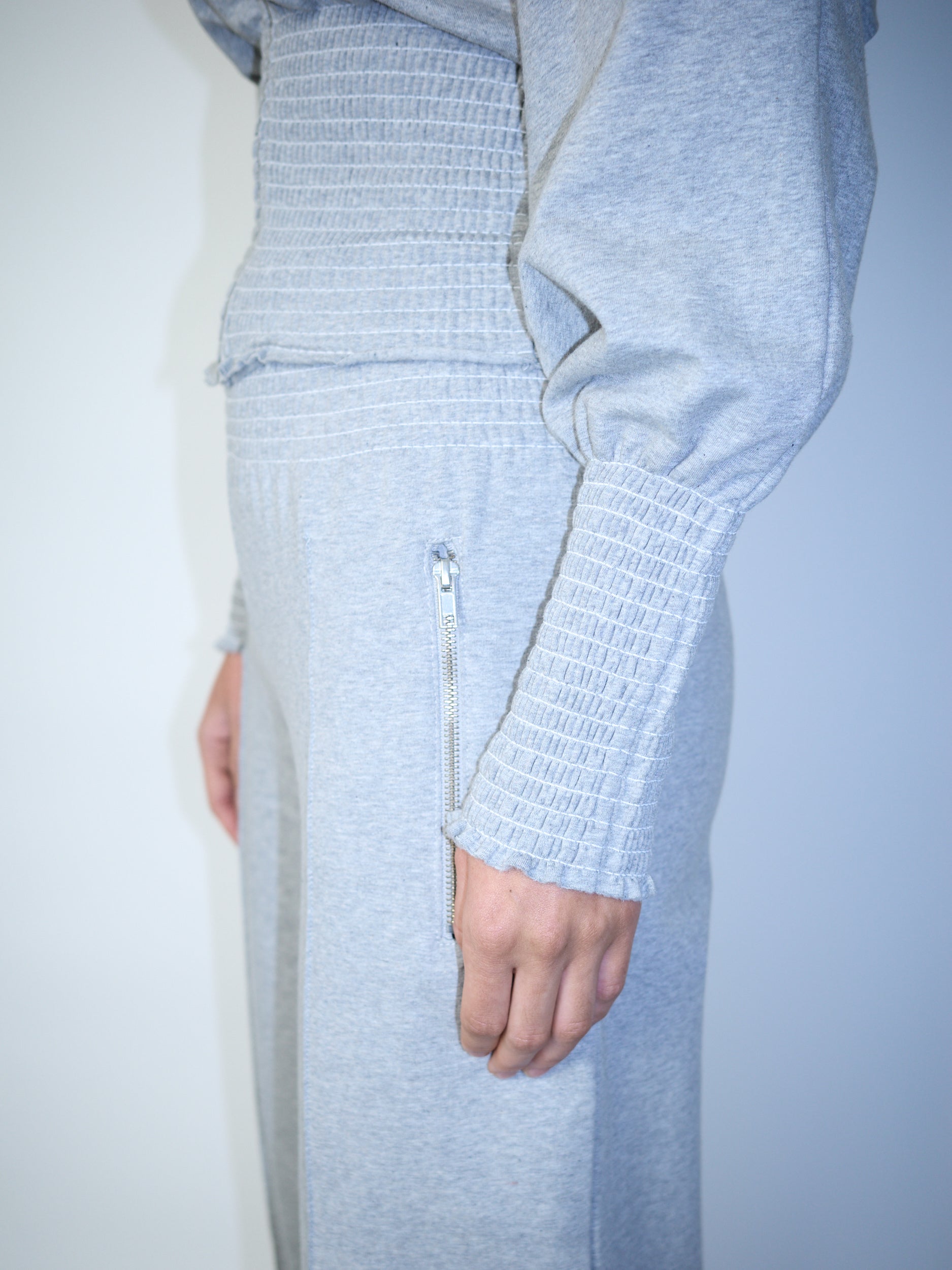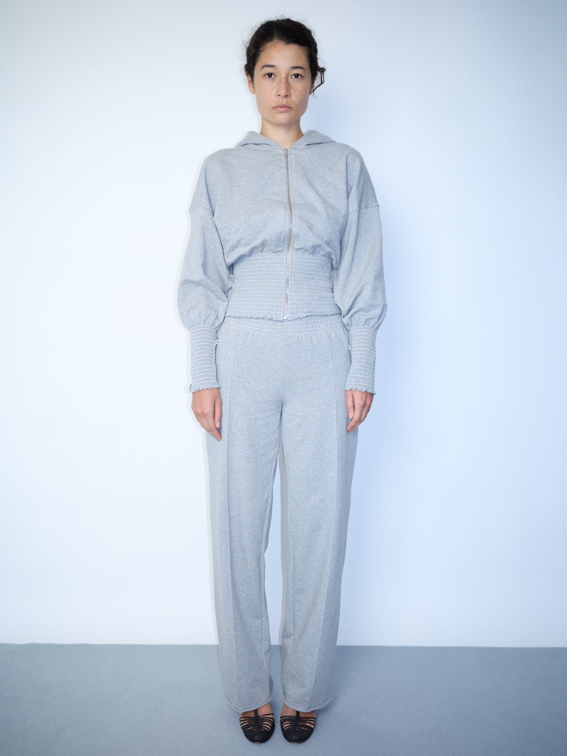 Hoodie with batwing sleeves and a relaxed silhouette. Features smocked elastic detailing at the arms and waist for a structured finish.