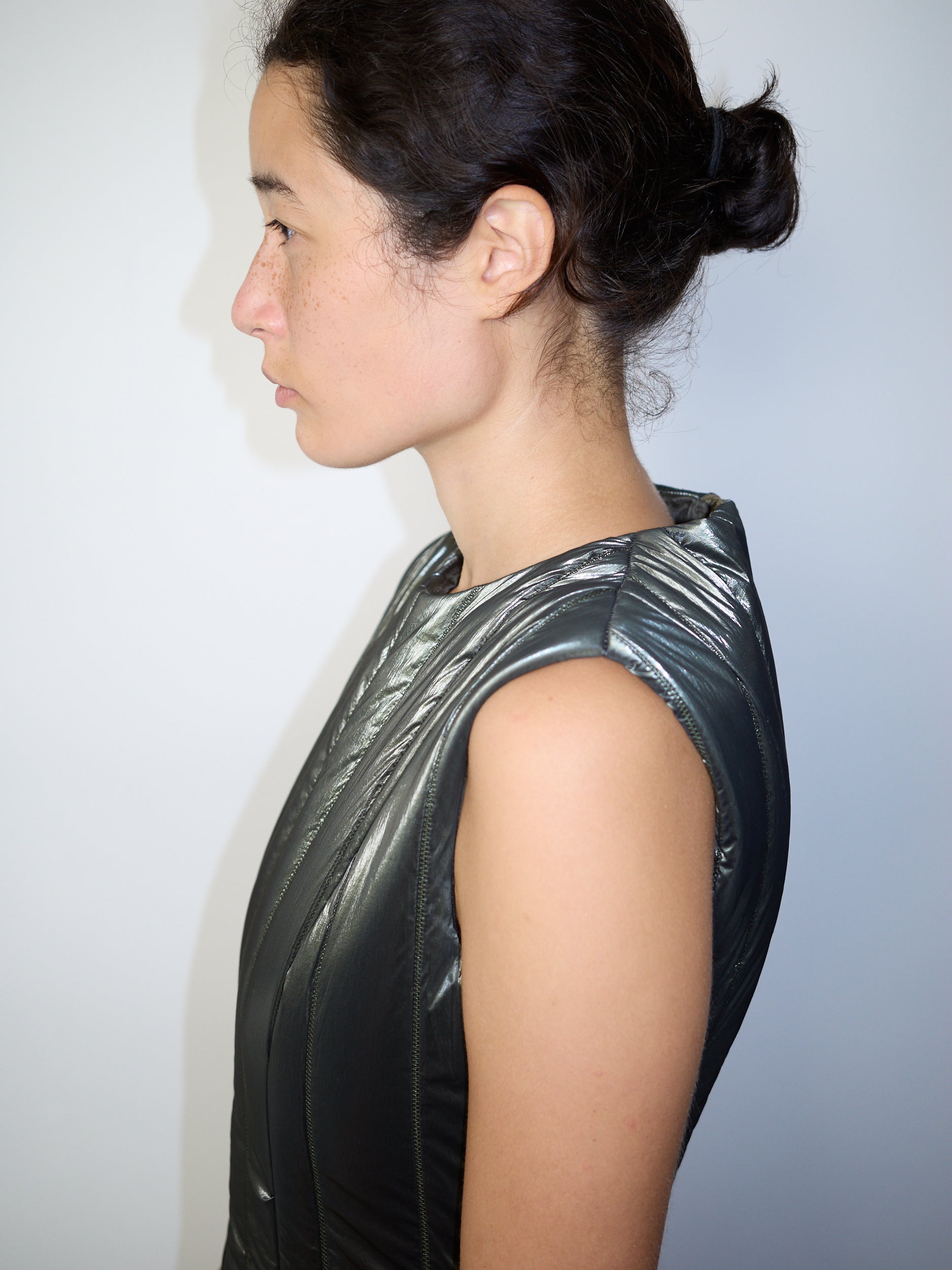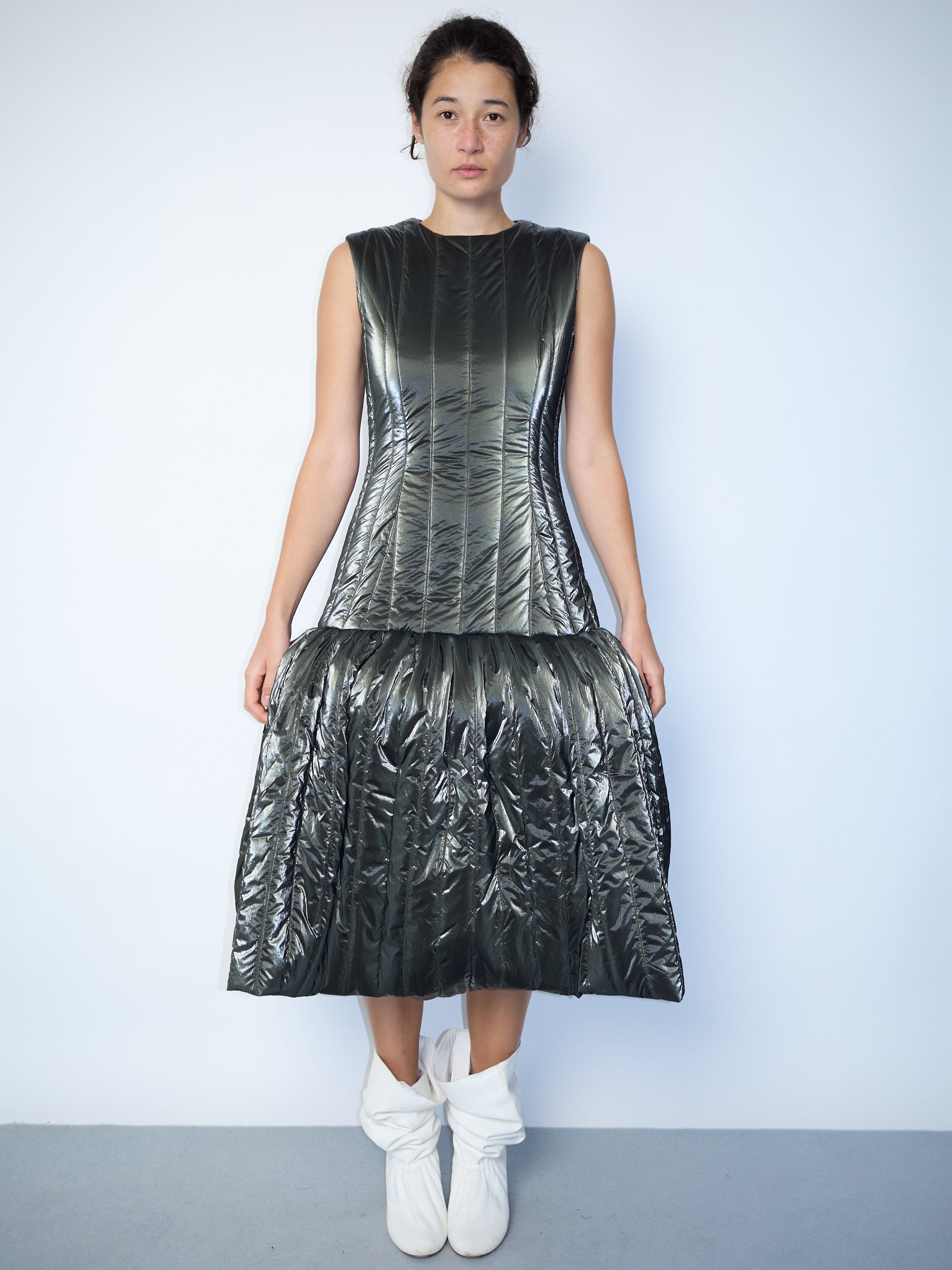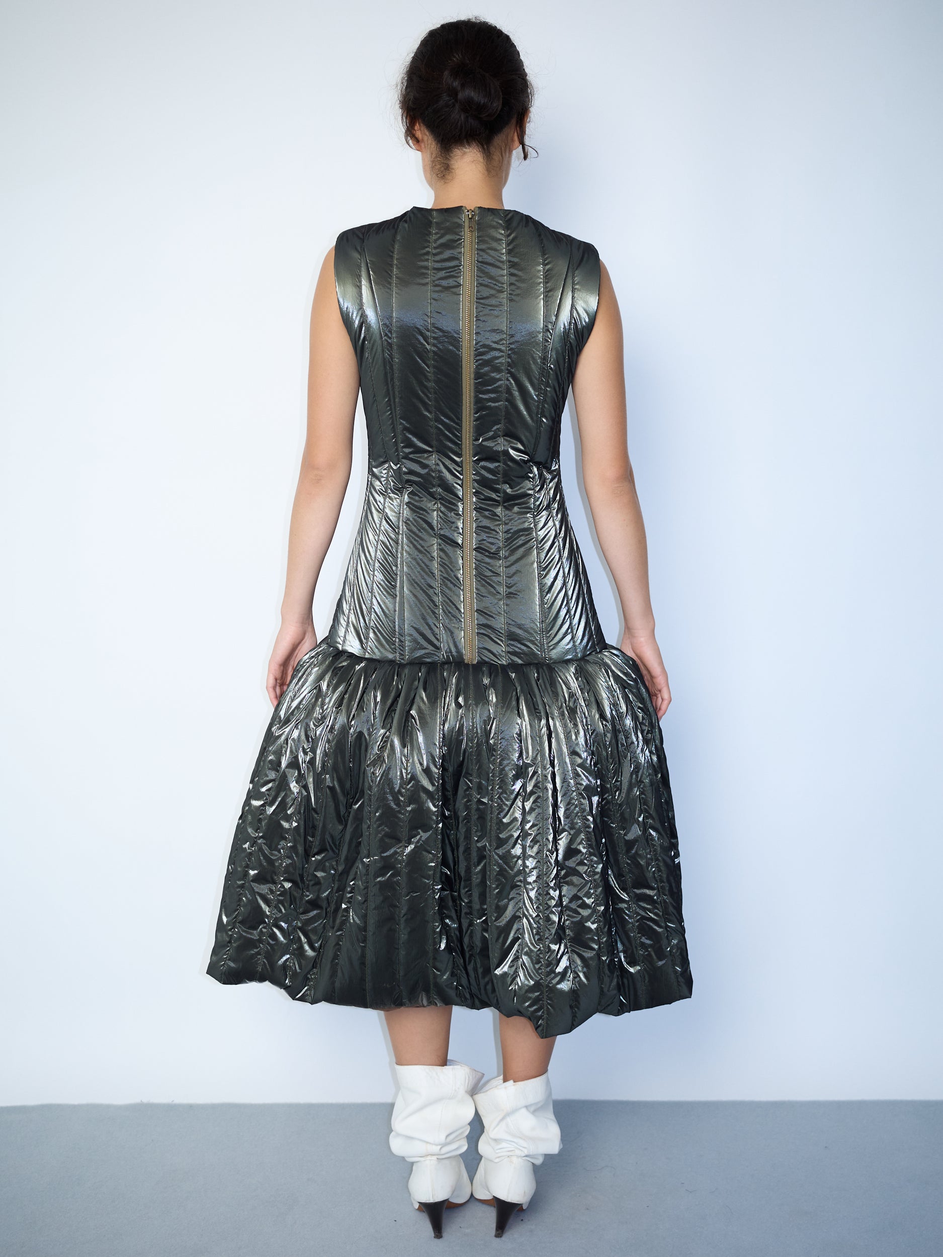This dress features a fitted bodice crafted from quilted fabric for texture and structure. The dropped waist leads into a voluminous balloon skirt for a modern, playful silhouette.