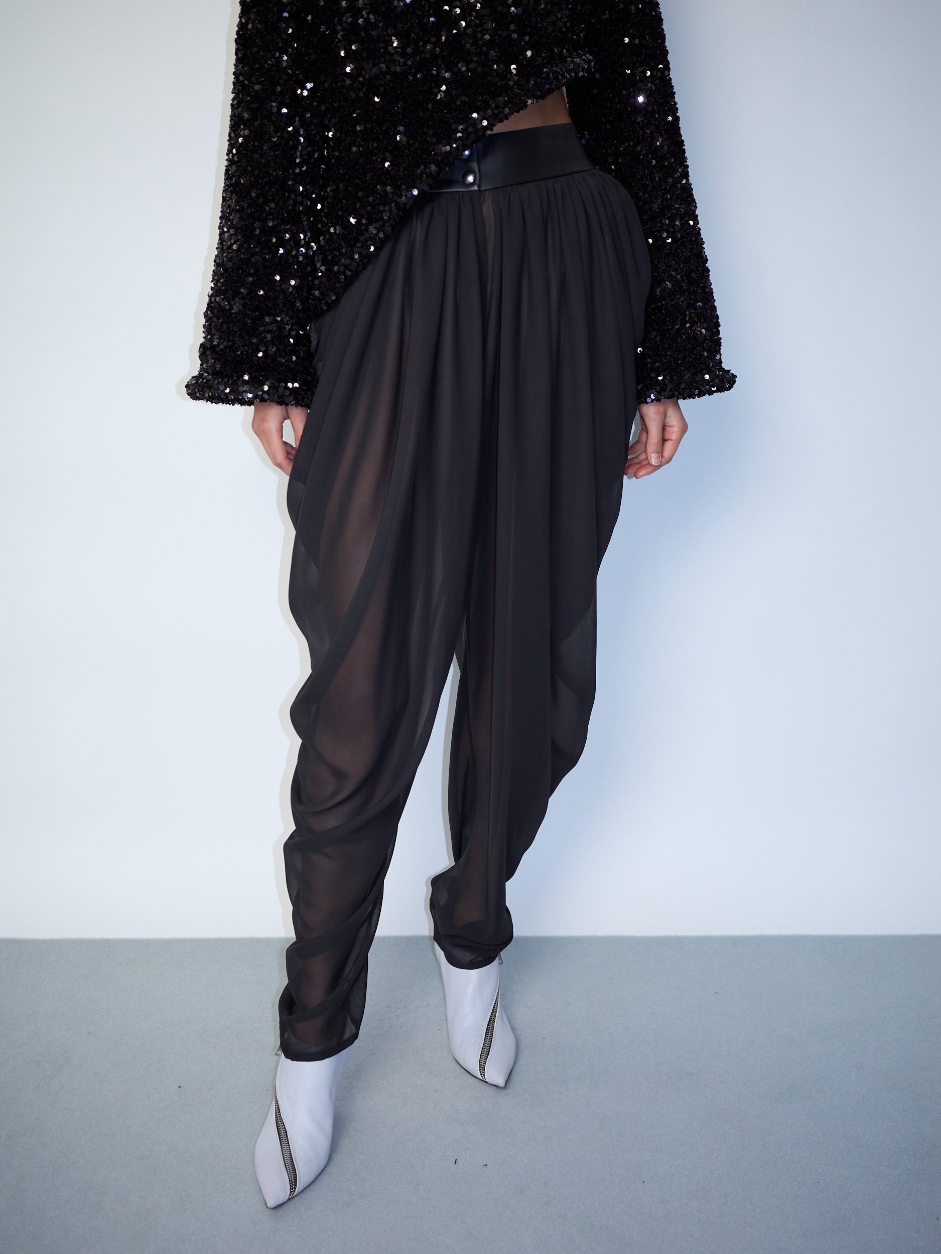 High-waisted chiffon trousers feature a soft draped silhouette that moves effortlessly. A structured leather waistband adds a contrasting edge, secured with a sleek press-button closure for a modern finish.