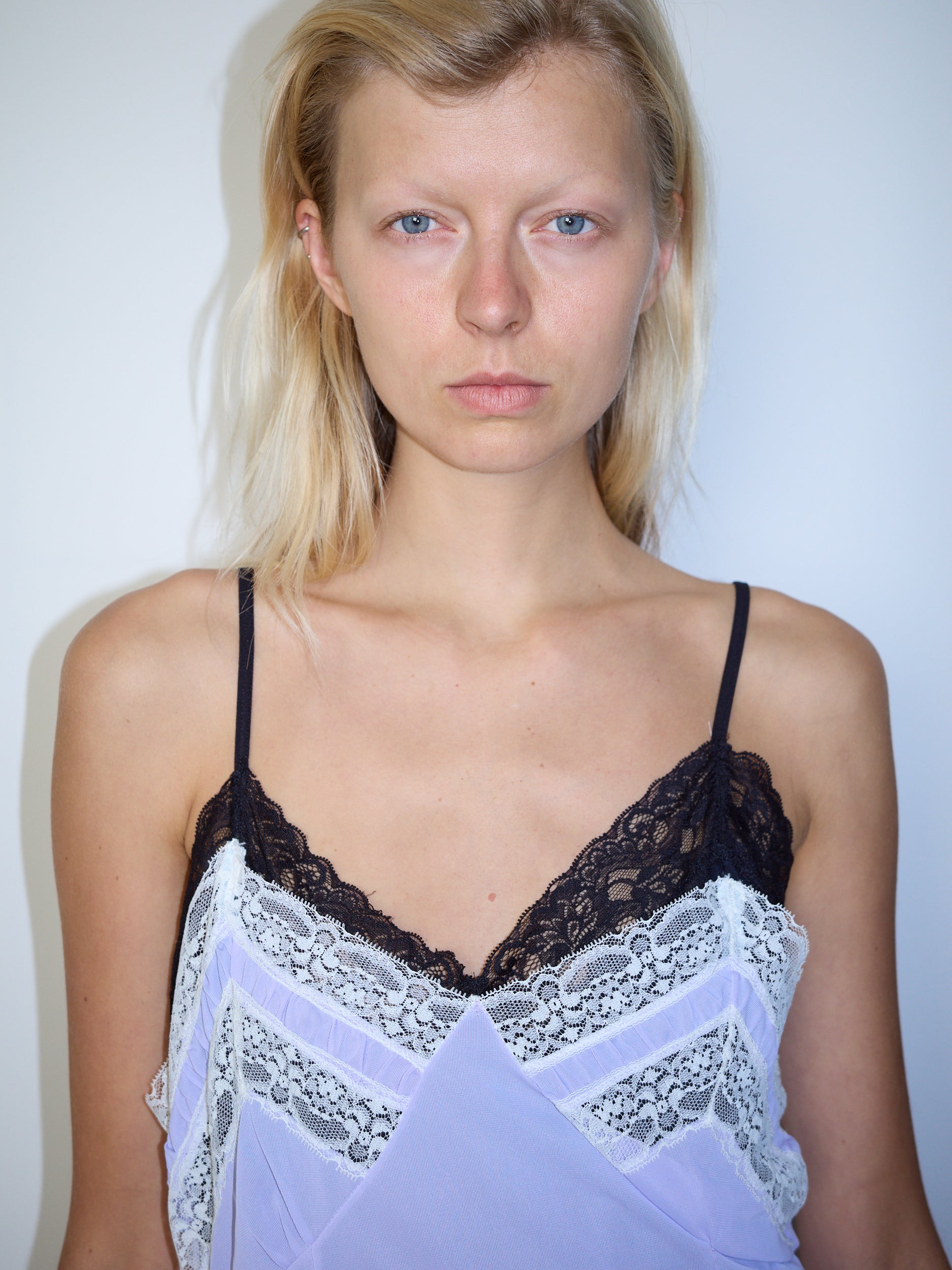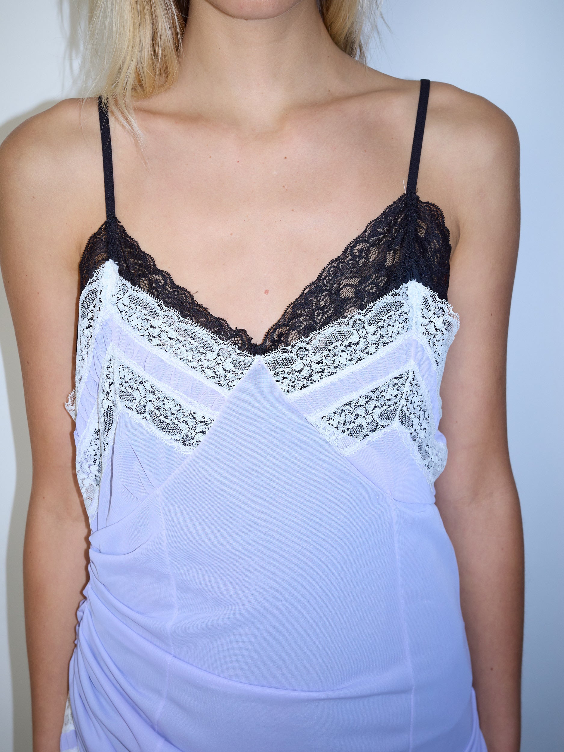 Layered slip-style dress featuring a sheer pale lavender overlay with delicate lace trim, draped over a black slip with visible lace detailing at the hem and neckline. This piece is crafted locally in our Copenhagen studio using upcycled vintage clothes sourced from local thrift stores. Each item is unique - small signs of wear and minor imperfections may occur, but all are fully functional as shown in the photos.