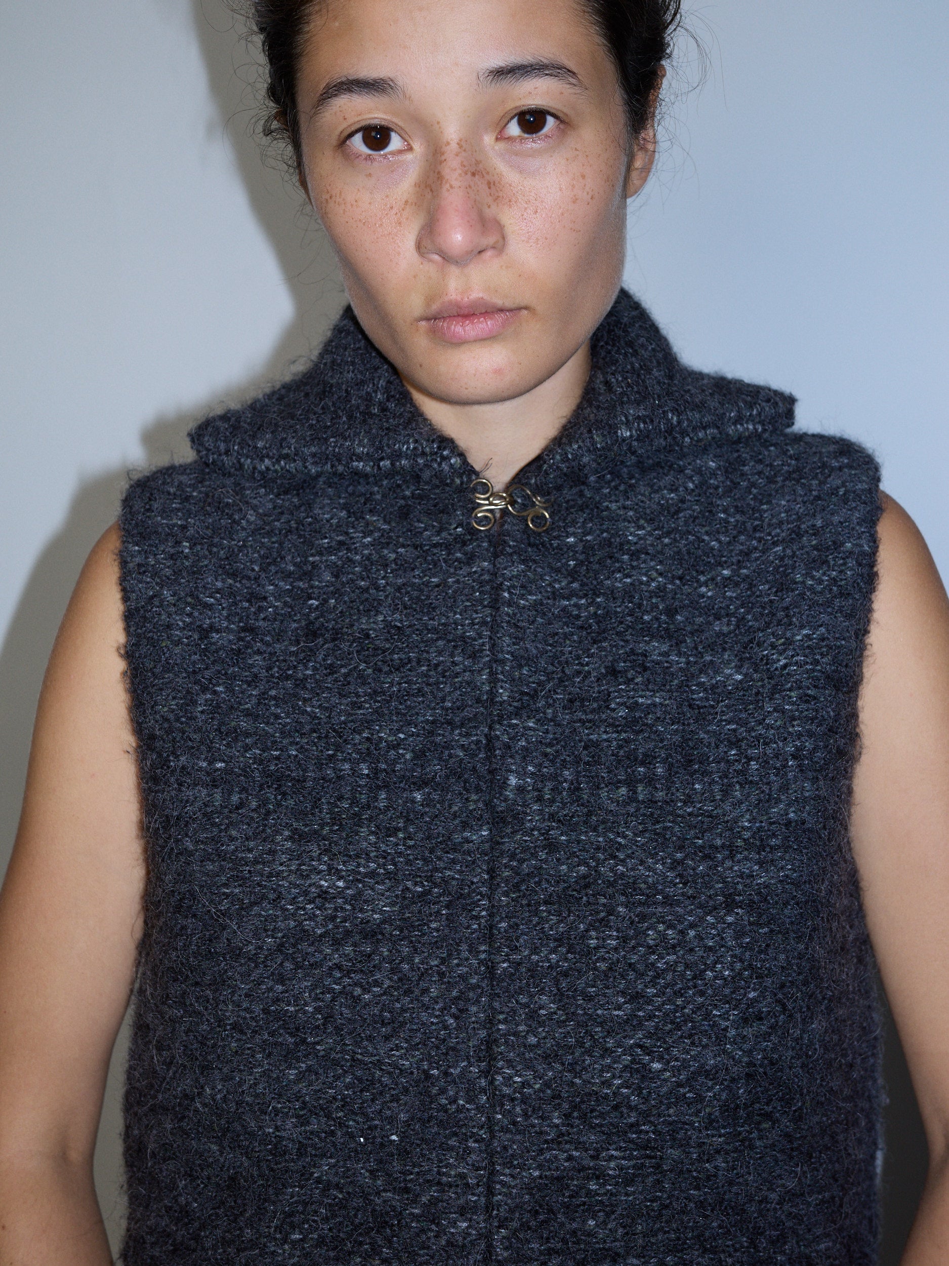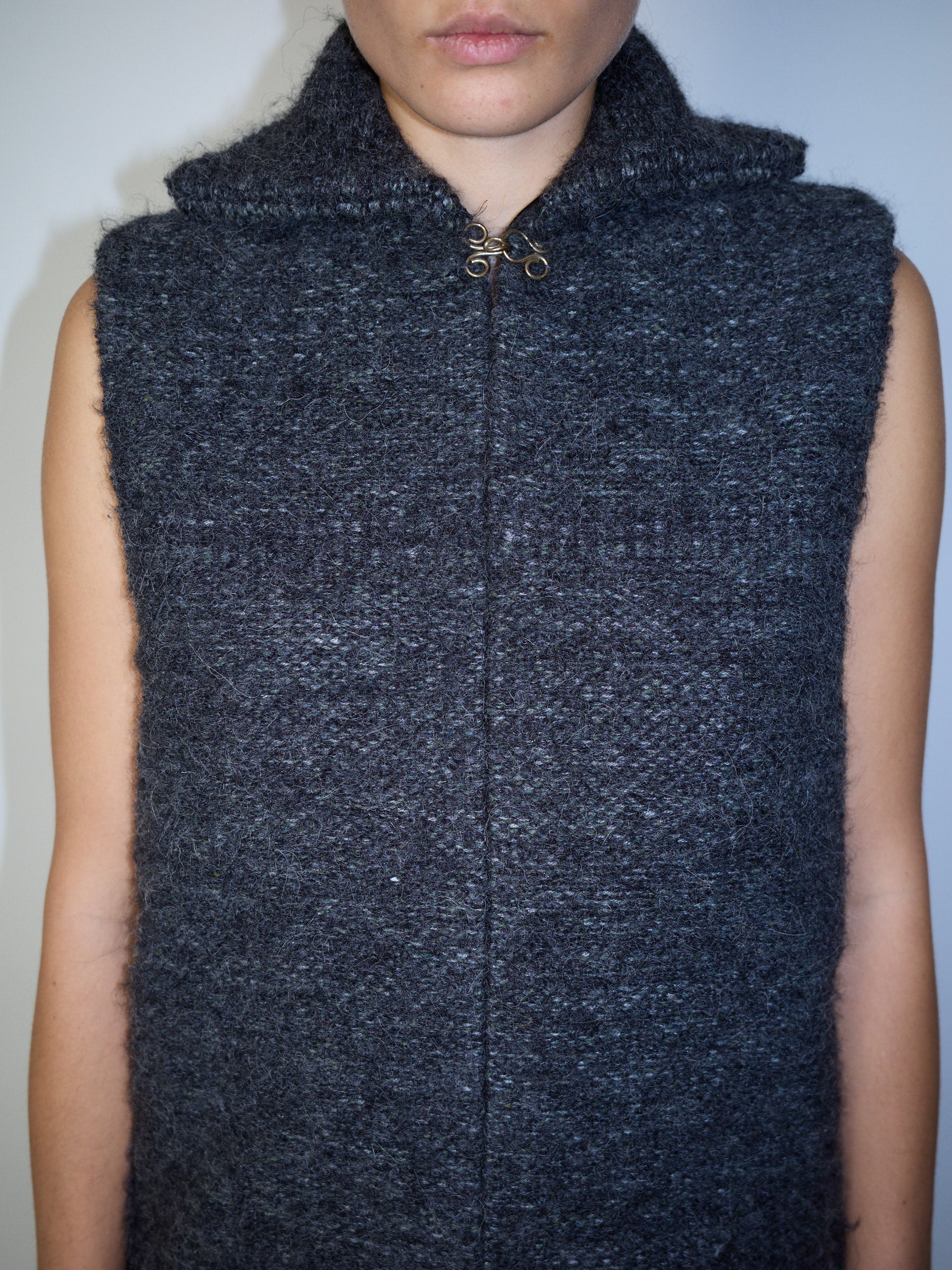 This sleeveless vest features a sailor-style collar and is crafted from hand-woven wool and mohair, offering a soft texture with a slight cocoon silhouette. Finished with a unique 925 silver hardware closure, handmade by Inger Grubbe, for a refined artisanal touch.