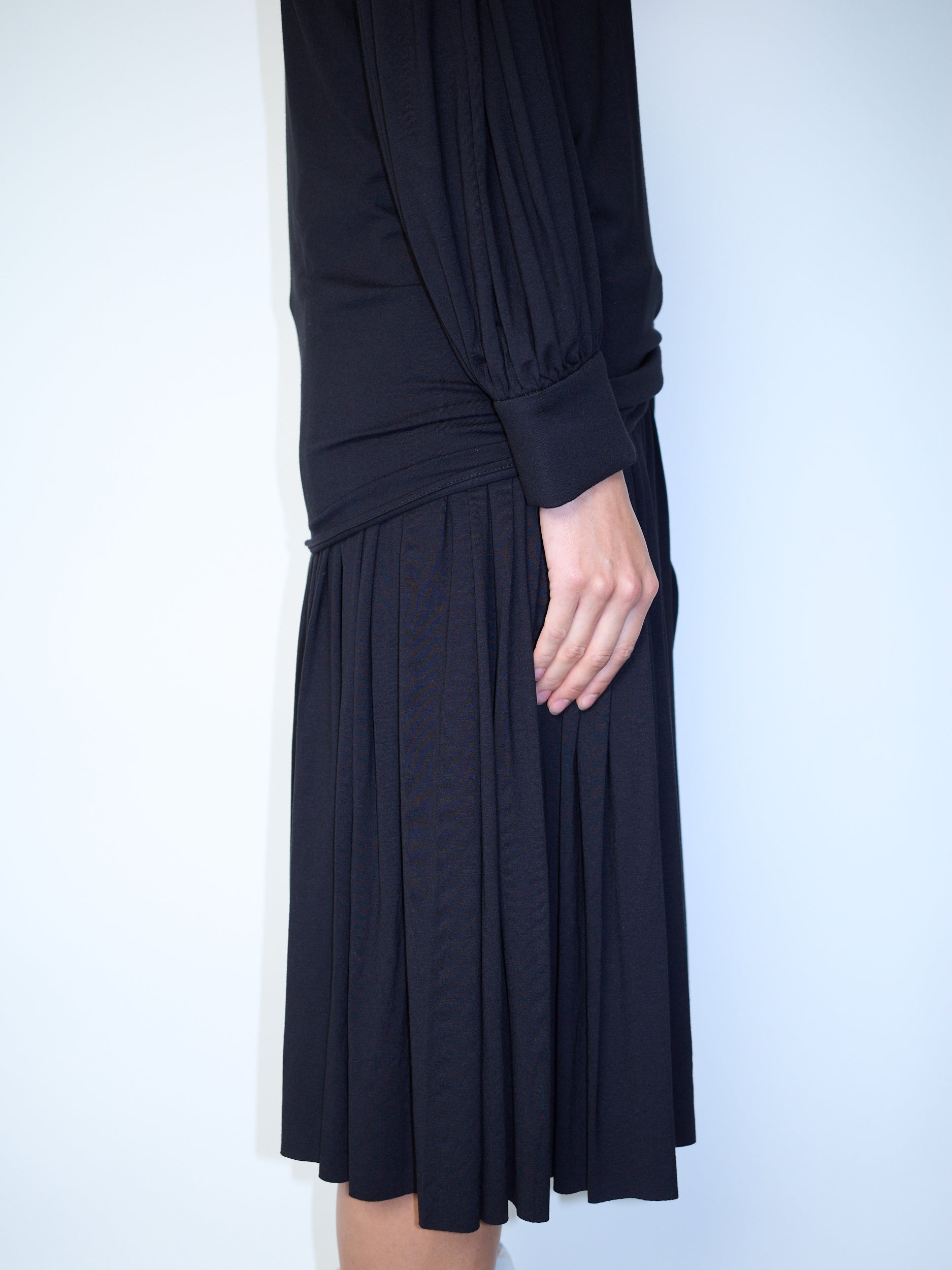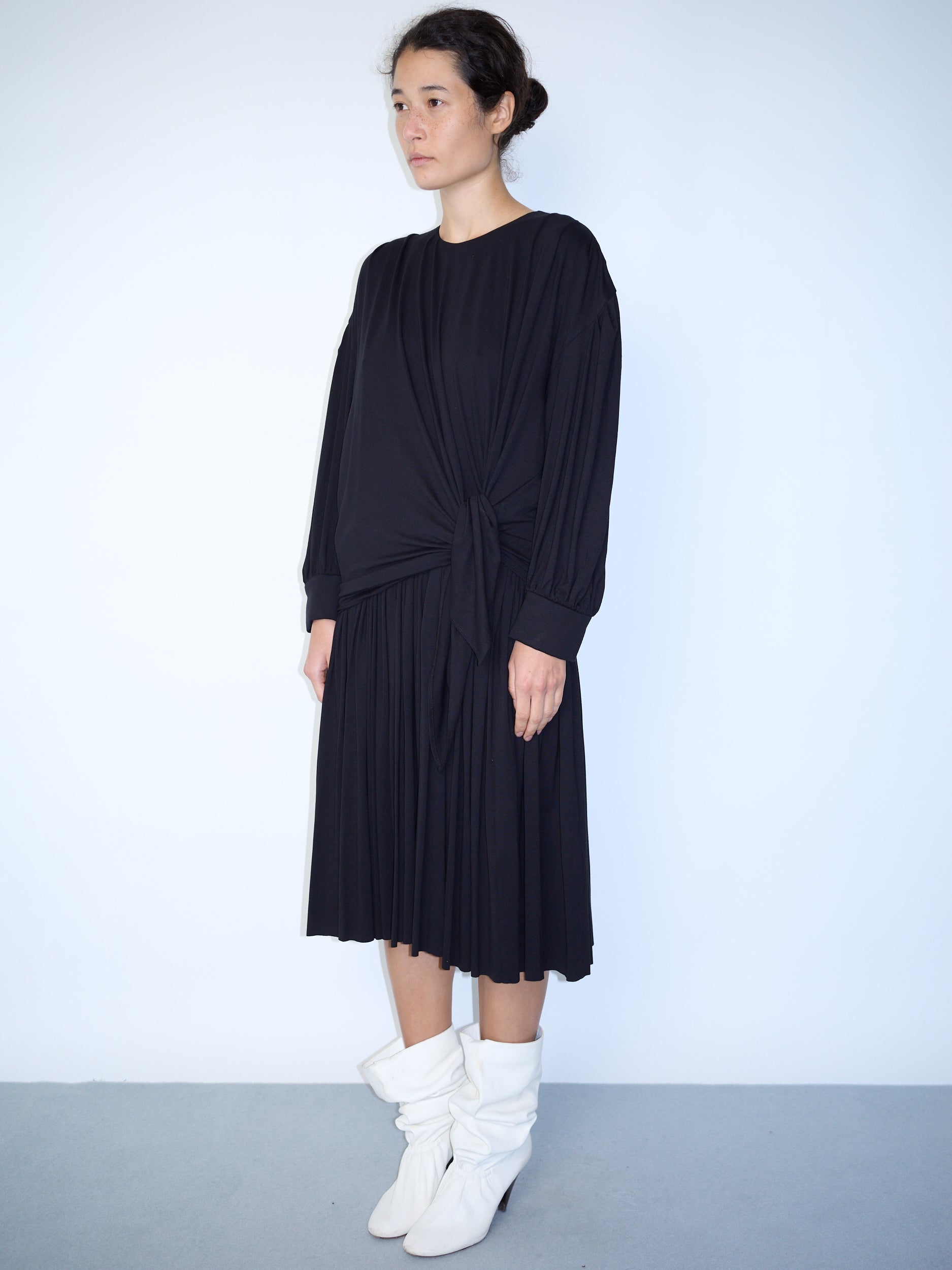 Jersey dress with dolman sleeves and an adjustable knot detail to shape the hips. Features a ruched jersey underskirt for added texture and fit.