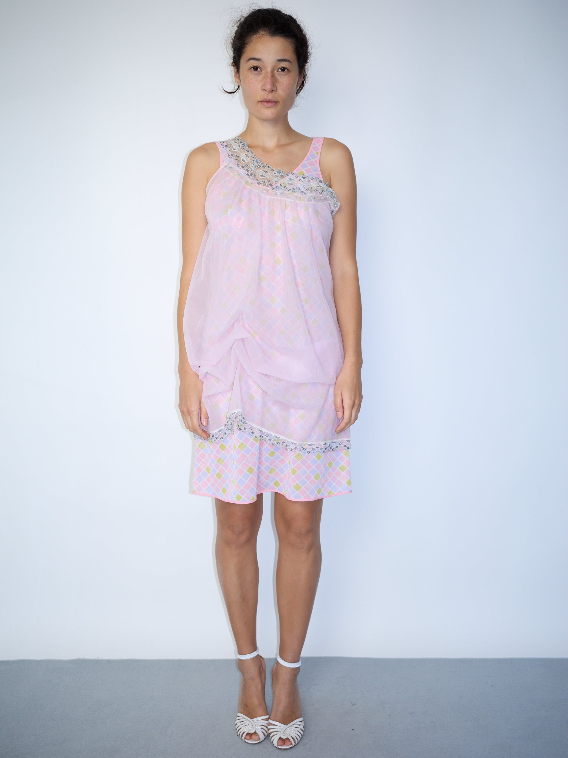 Layered slip-style dress featuring a sheer pale pink overlay with delicate lace trim, draped over a patterned slip with visible lace detailing at the hem and neckline. This piece is crafted locally in our Copenhagen studio using upcycled vintage clothes sourced from local thrift stores. Each item is unique - small signs of wear and minor imperfections may occur, but all are fully functional as shown in the photos.