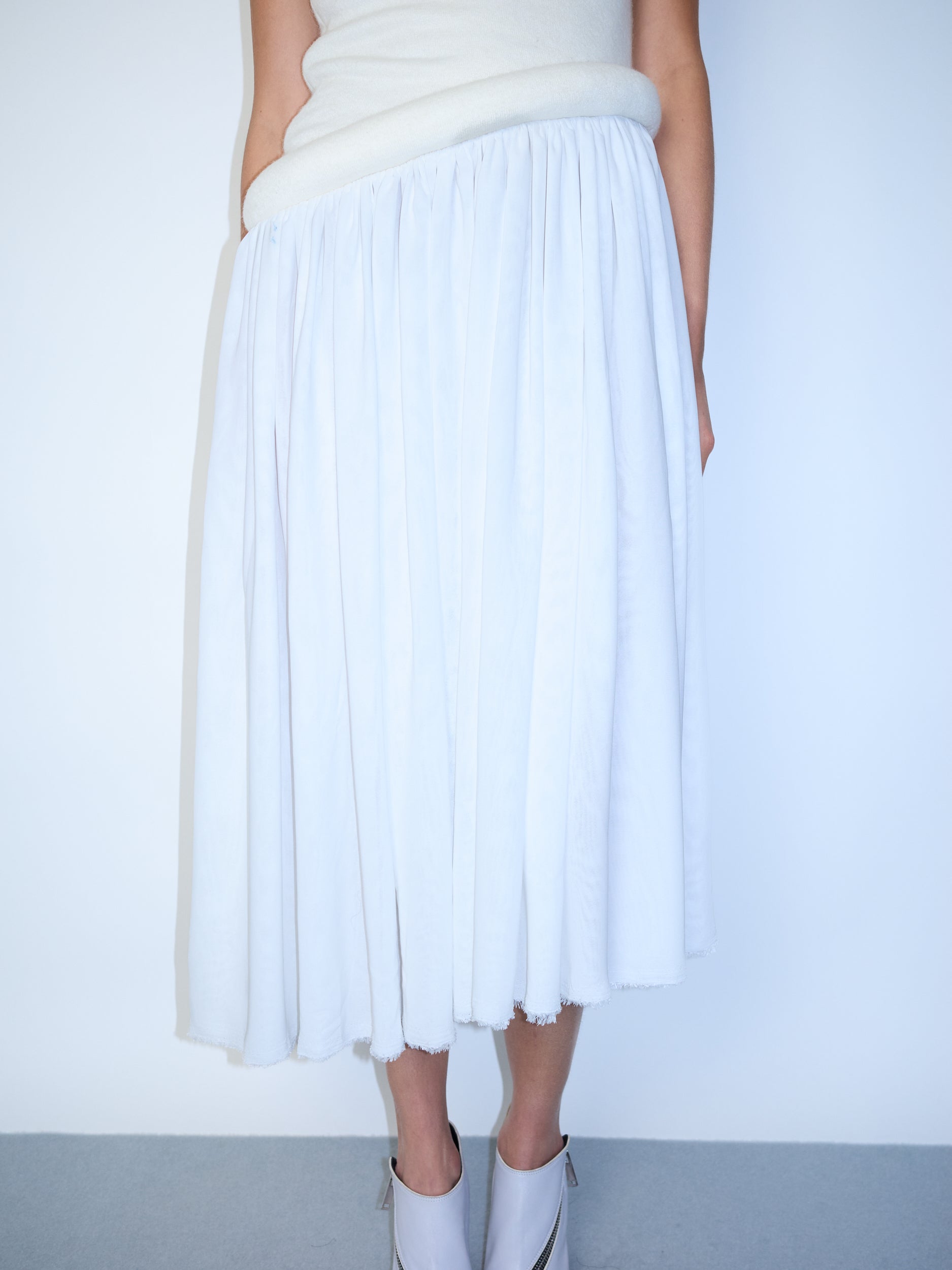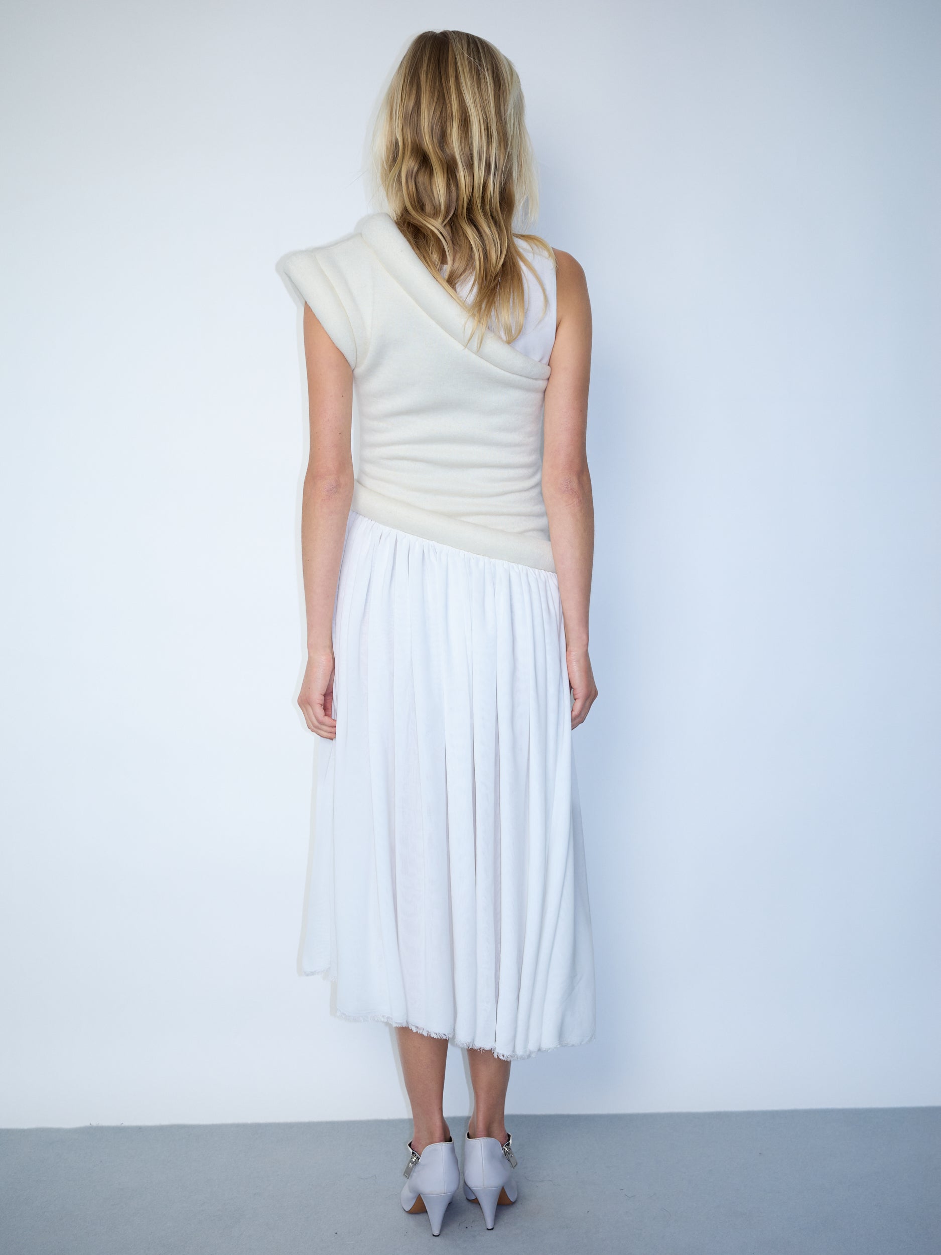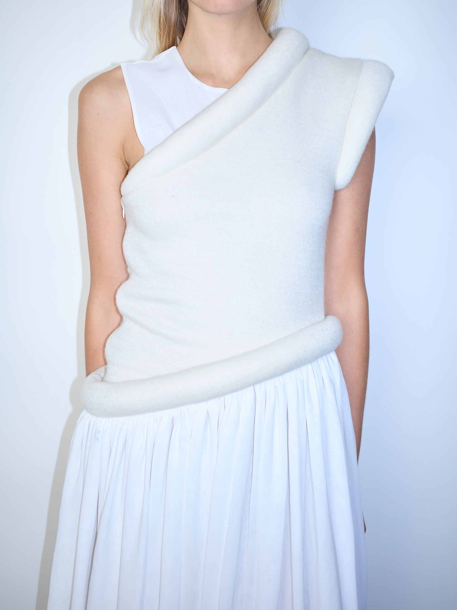 Trompe L’oeil Dress featuring a sculptural bodice with stuffed tubing detail. Finished with a double-layer asymmetrical cream chiffon skirt.