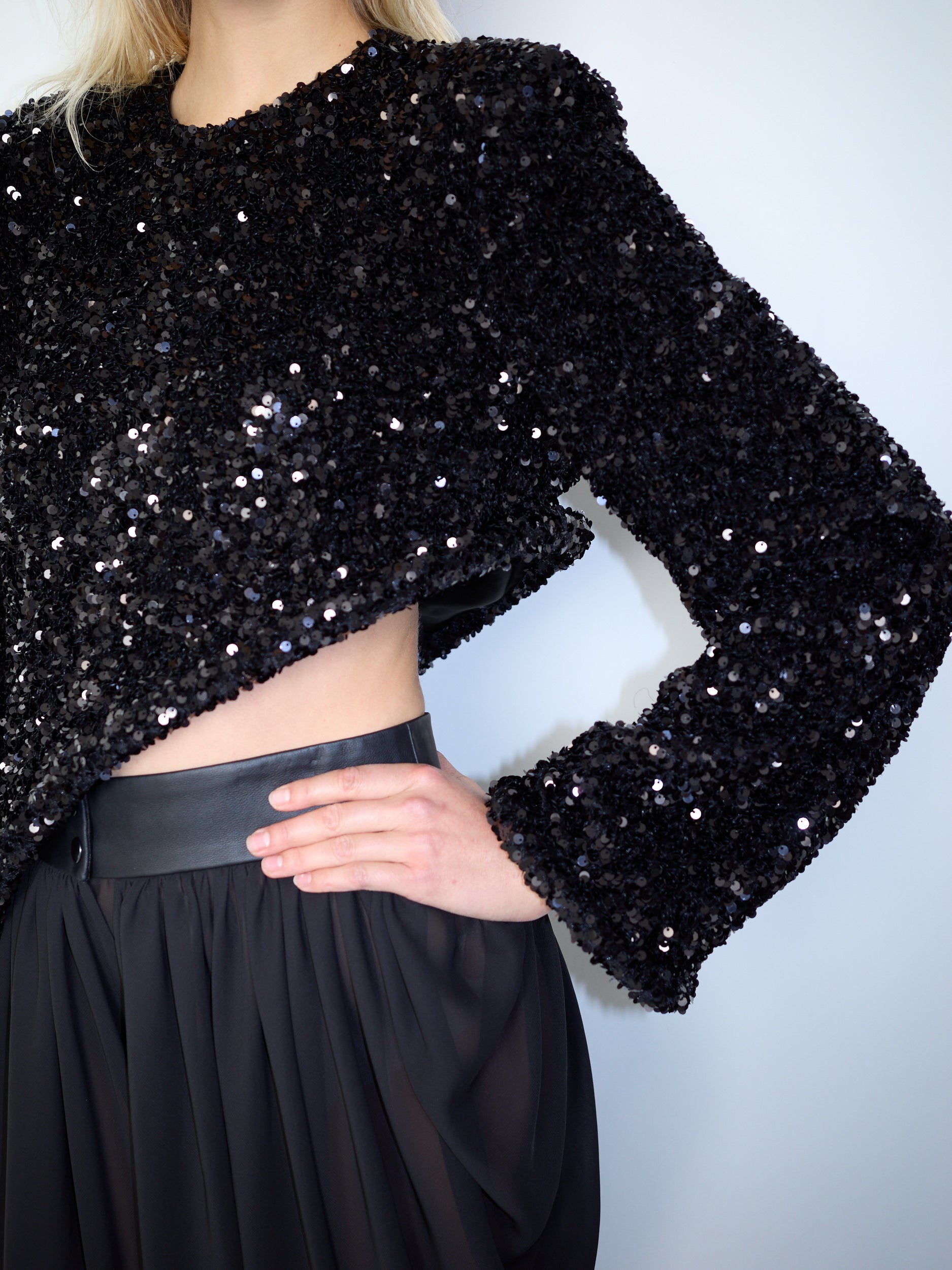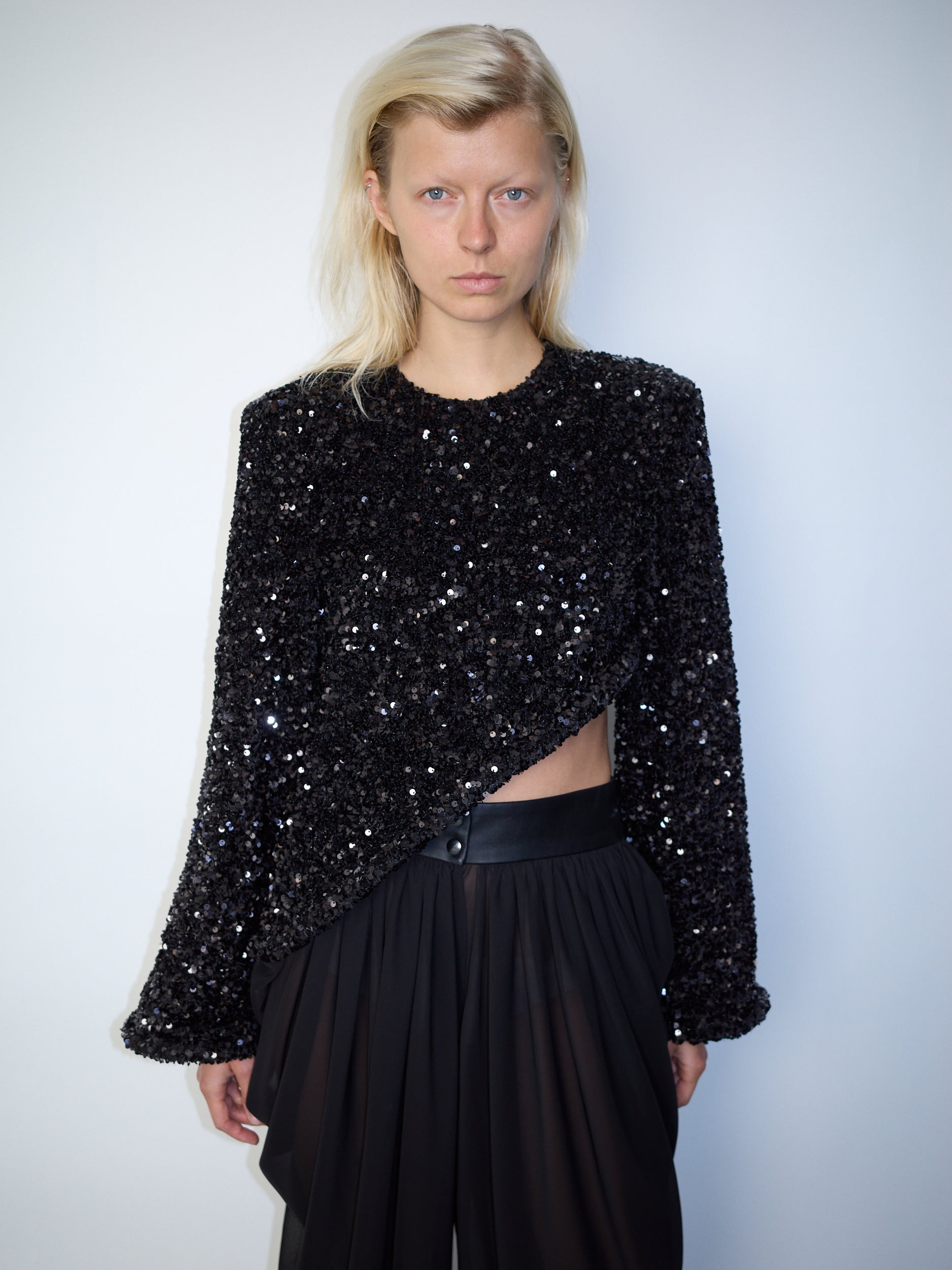 This long-sleeved top features an asymmetrical fit in plush velvet, embellished all over with shimmering sequins. Finished with distinctive tube detailing along the sleeves and hem.