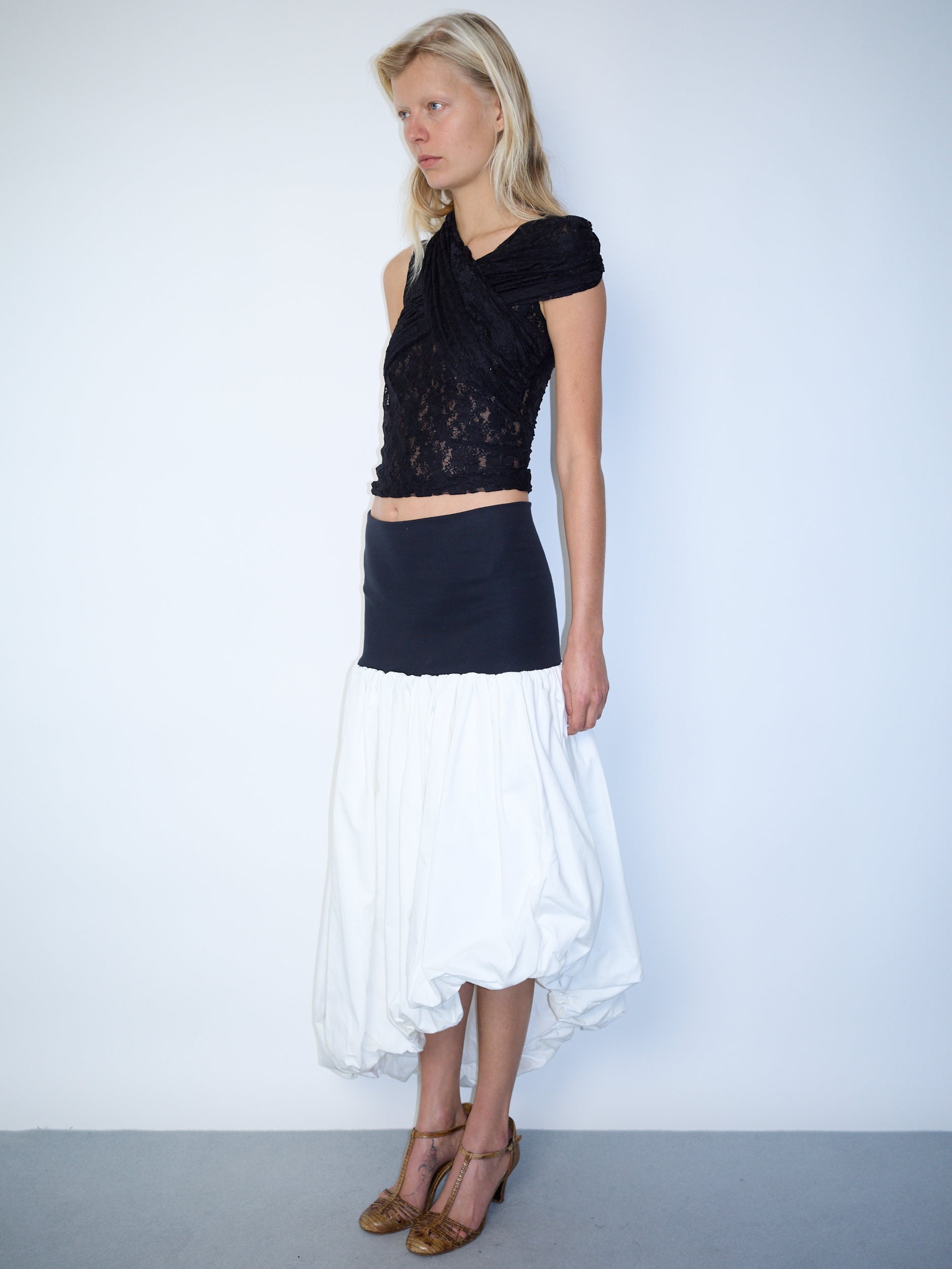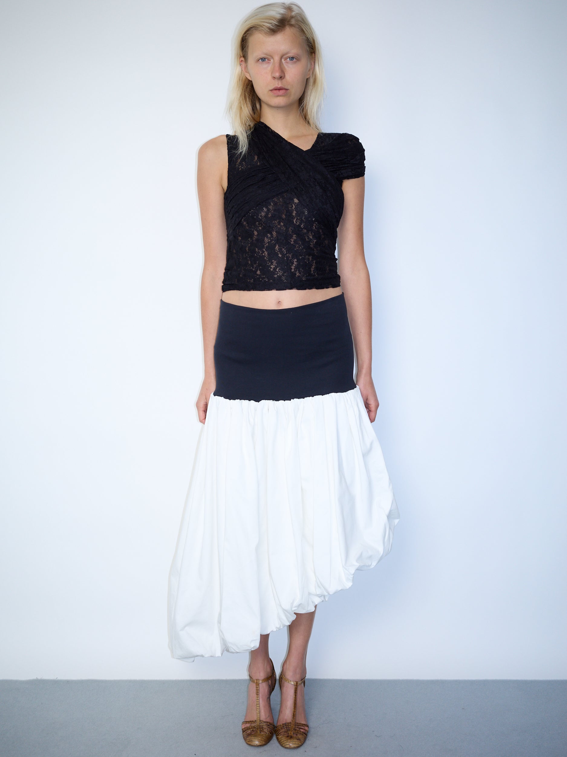 This skirt features a comfortable stretchy jersey waistband paired with a bold, oversized asymmetrical balloon skirt. The sculptural silhouette adds drama and movement for a standout look.