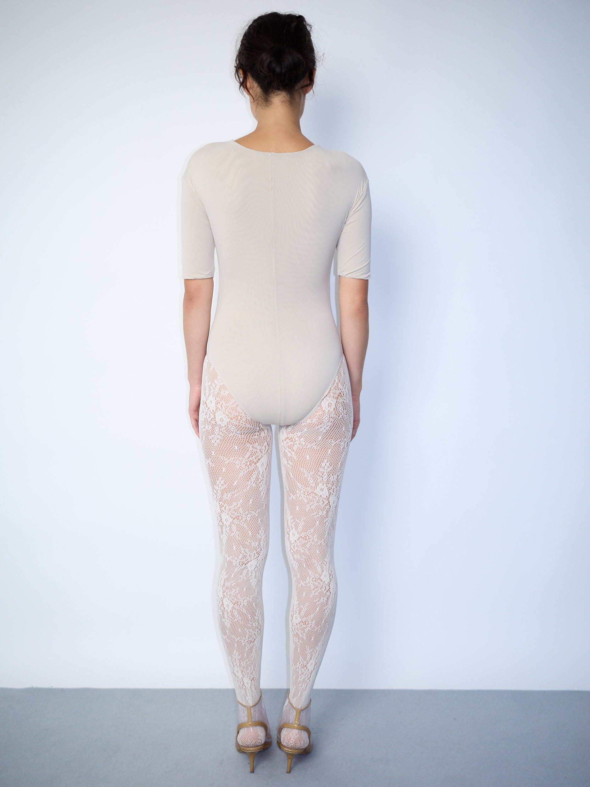 Double-layer bodysuit in soft, stretchy mesh with short sleeves. Features draped detailing at the neckline and waist for a flattering silhouette.