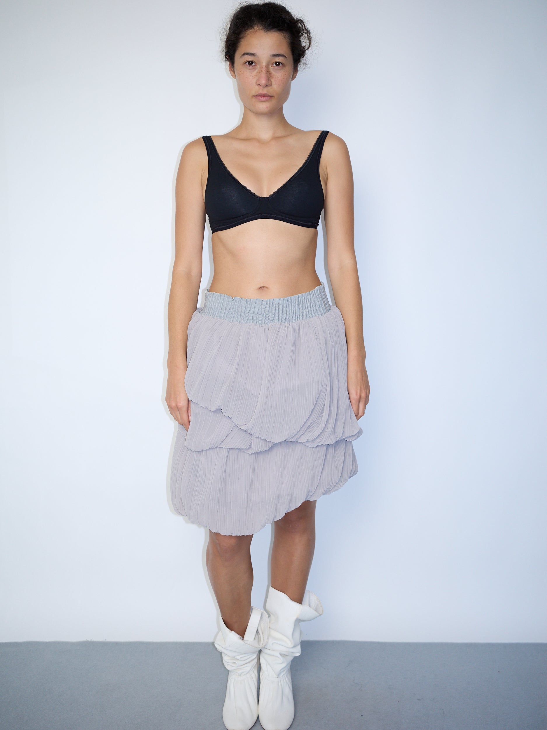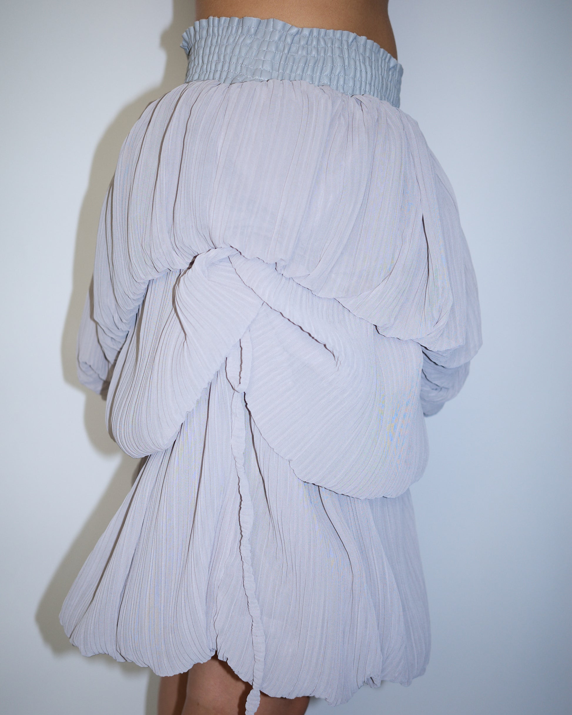 This asymmetrical double-layer skirt is crafted from deadstock plissé fabric, featuring a versatile strap that lets you adjust the length. It’s finished with an elastic smocked leather waistband for a comfortable yet chic fit.