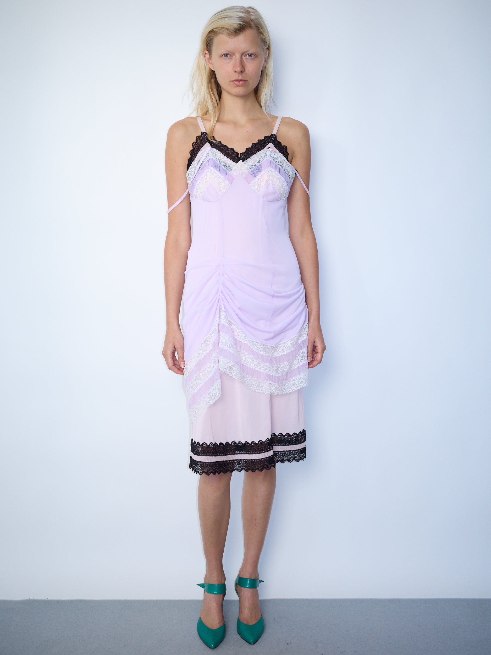 Layered slip-style dress featuring a sheer pale lilac overlay with delicate lace trim, draped over a pink slip with visible lace detailing at the hem and neckline. This piece is crafted locally in our Copenhagen studio using upcycled vintage clothes sourced from local thrift stores. Each item is unique - small signs of wear and minor imperfections may occur, but all are fully functional as shown in the photos.