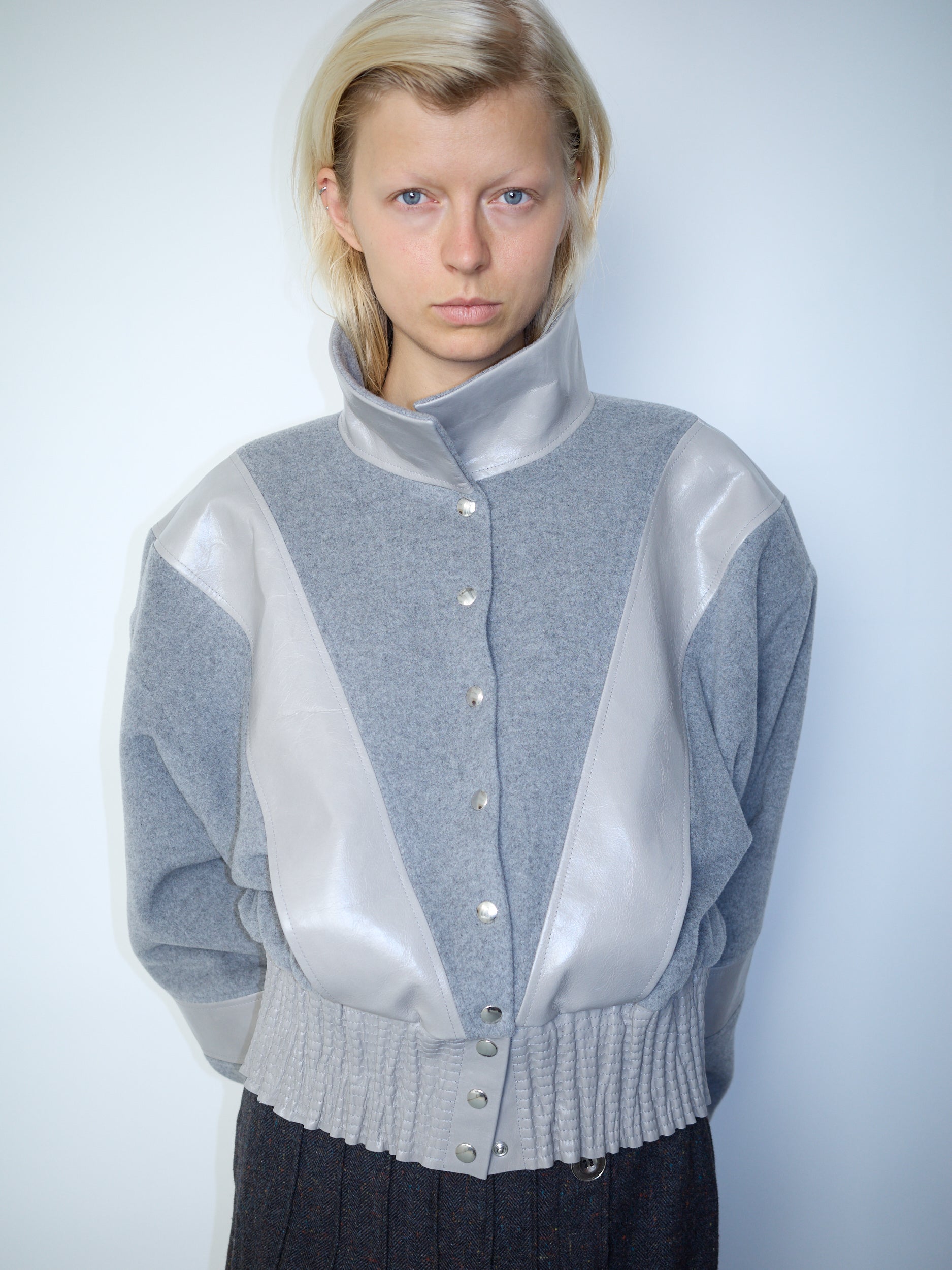 This oversized wool jacket features batwing sleeves and contrasting leather panels for a structured yet dynamic look. Finished with smocked elastic detailing at waist and cuffs and features a snap button closure.