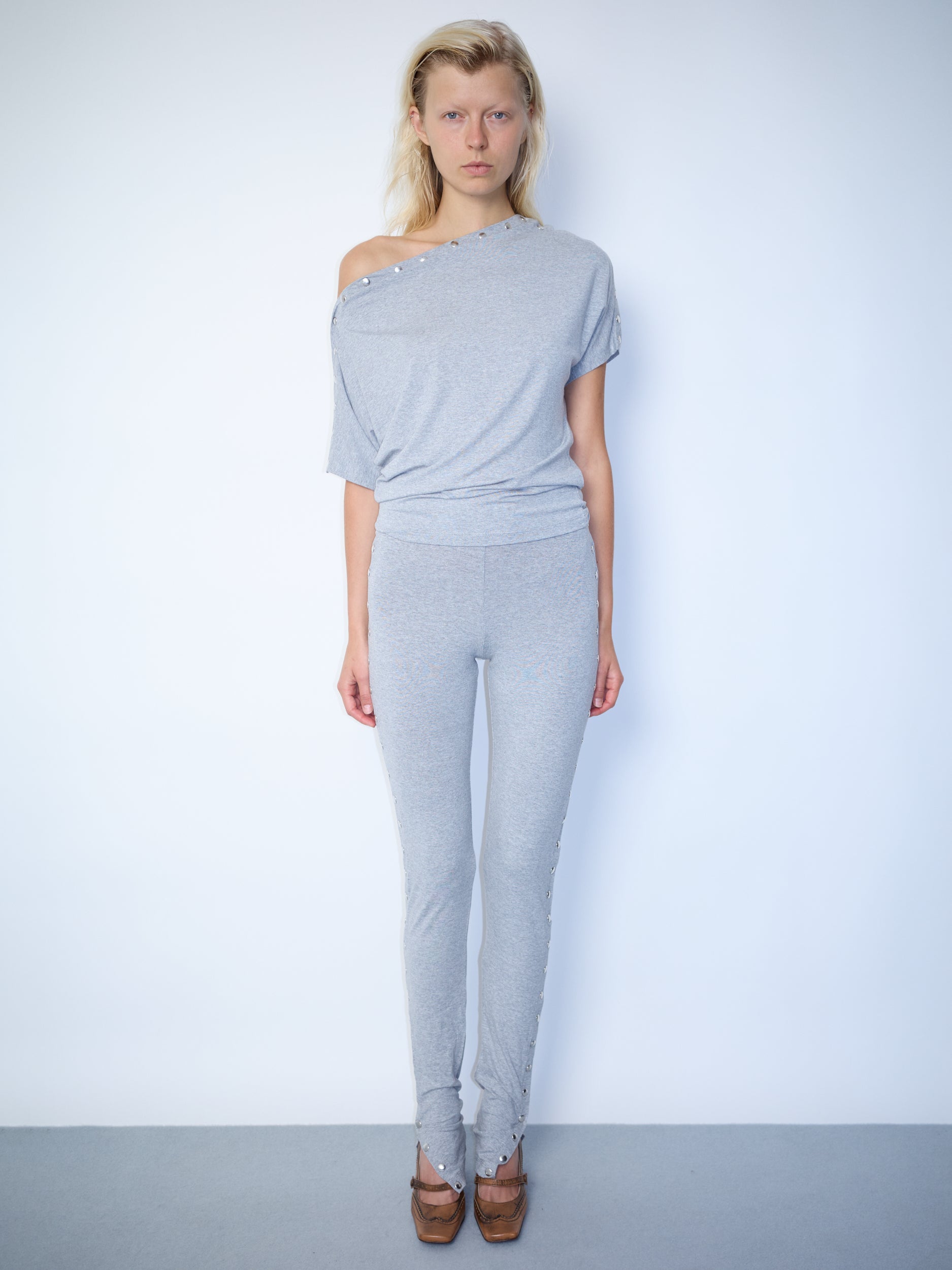 Leggings featuring press buttons running down the full length of the sides. Designed with extra length for a sleek, elongated look.